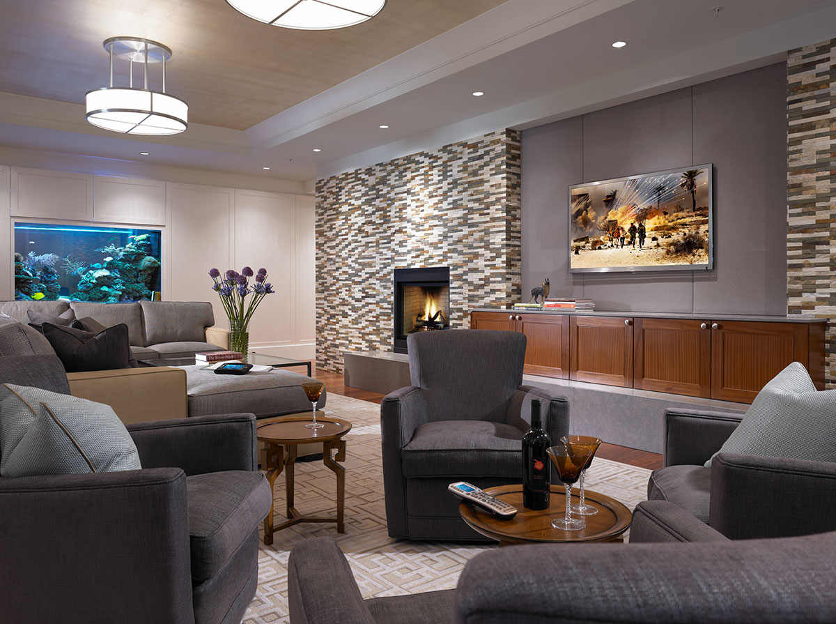 A Crestron PAC2M control system handles the lighting control throughout the home. Custom programming provided by Creative Systems gave the client the exact presets he wanted. When the homeowner exits the elevator and arrives at home, he is welcomed by a dimly lit sconce in the foyer, accented by the blue light from the double-sided saltwater aquarium that allows him to see through into the living room. The homeowner can select multiple “HOME” buttons to create the desired mood as he walks through the door into the sprawling residence. For late nights, subtle lighting accents the hallways. During the day, lights are set to a more vibrant scene.
