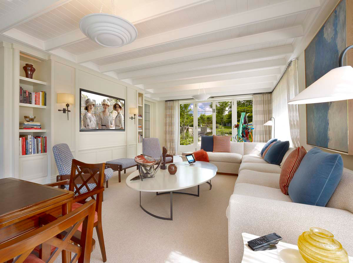 Of course the team included a property-wide audio and video distribution system as well, with loudspeakers in almost every room and televisions in many rooms as well. Crestron DigitalMedia and multi-room audio products made that possible. The distances that the signals travel are immense, so Elite Home Technologies installed roughly 15,000 feet of fiber-optic cable to serve the entertainment systems.