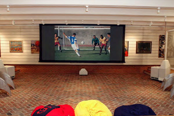 The homeowners love high-end video, so the team used a motorized 204” Stewart Filmscreen® CinemaScope screen and a Wolf Cinema projector hidden in a niche in the wall. To satisfy their love of high-quality audio and ensure a smooth transition from theater to gallery, they created a system where the homeowners could roll the Wilson Audio theater loudspeakers out of the room during an art show.